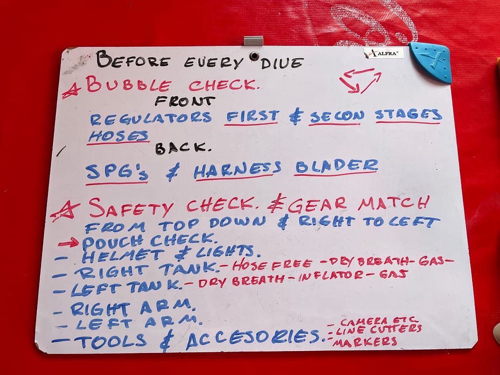 午前は、毎ダイブ必ず行うチェック項目について座学で学び、午後は視界ゼロ(ゼロビジ)でのトラブル対処トレーニングを実施しました。